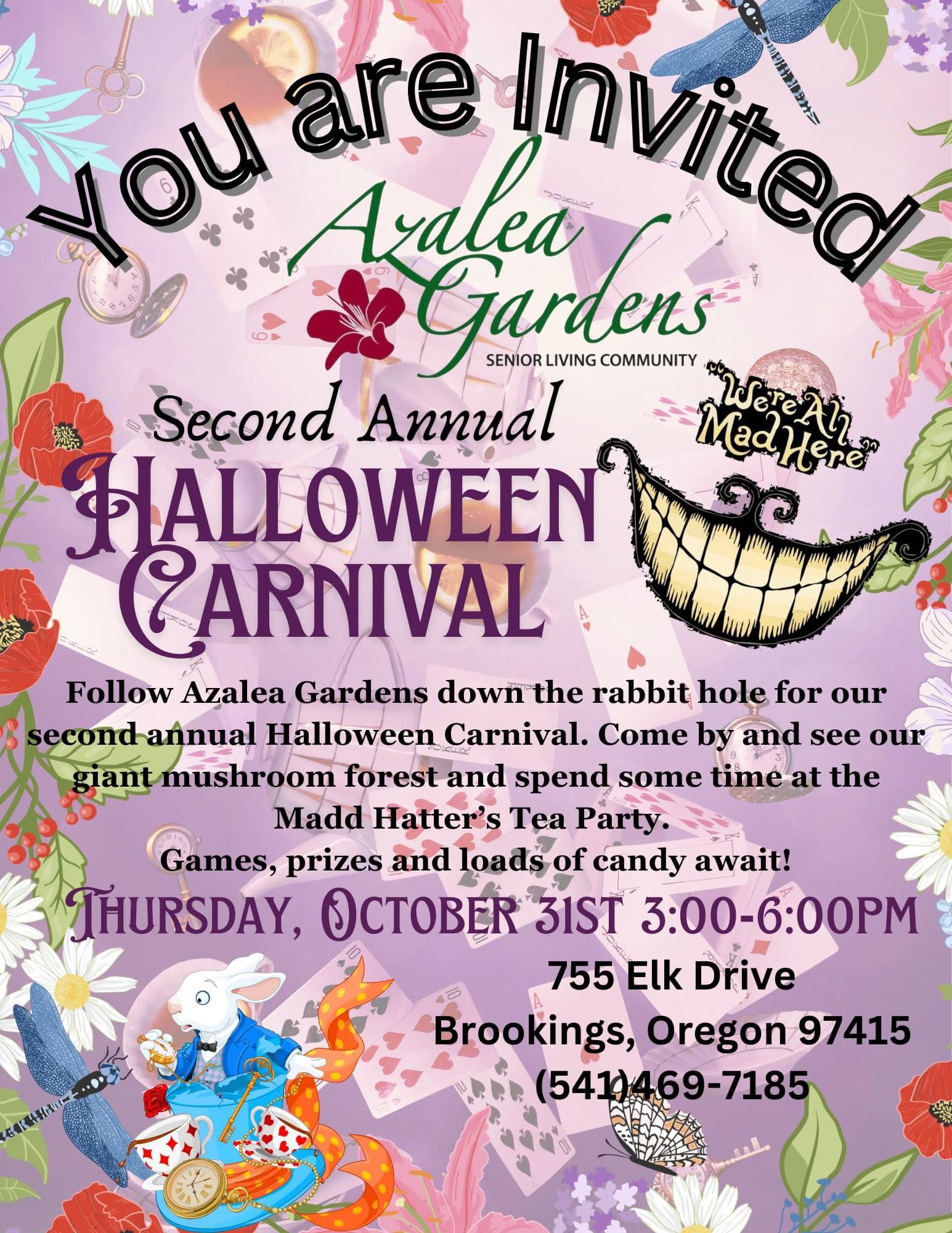 👻🕷️You’re invited! 🎃🕸️ Join us at Azalea Gardens Senior Living for our second annual Halloween Carnival, where this year's theme is Alice in Wonderland! 🌈✨ 🕒 Time: 3 PM - 6 PM 📅 Date: October 31st 📍 Location: Azalea Gardens Senior Living Wander through our enchanting giant mushroom forest and take a seat at the Madd Hatter's Tea Party. There will be games, prizes, and plenty of candy for everyone to enjoy! Bring your friends and family for a whimsical day of fun and festivities. We can't wait to see you there!🍭☺️Images