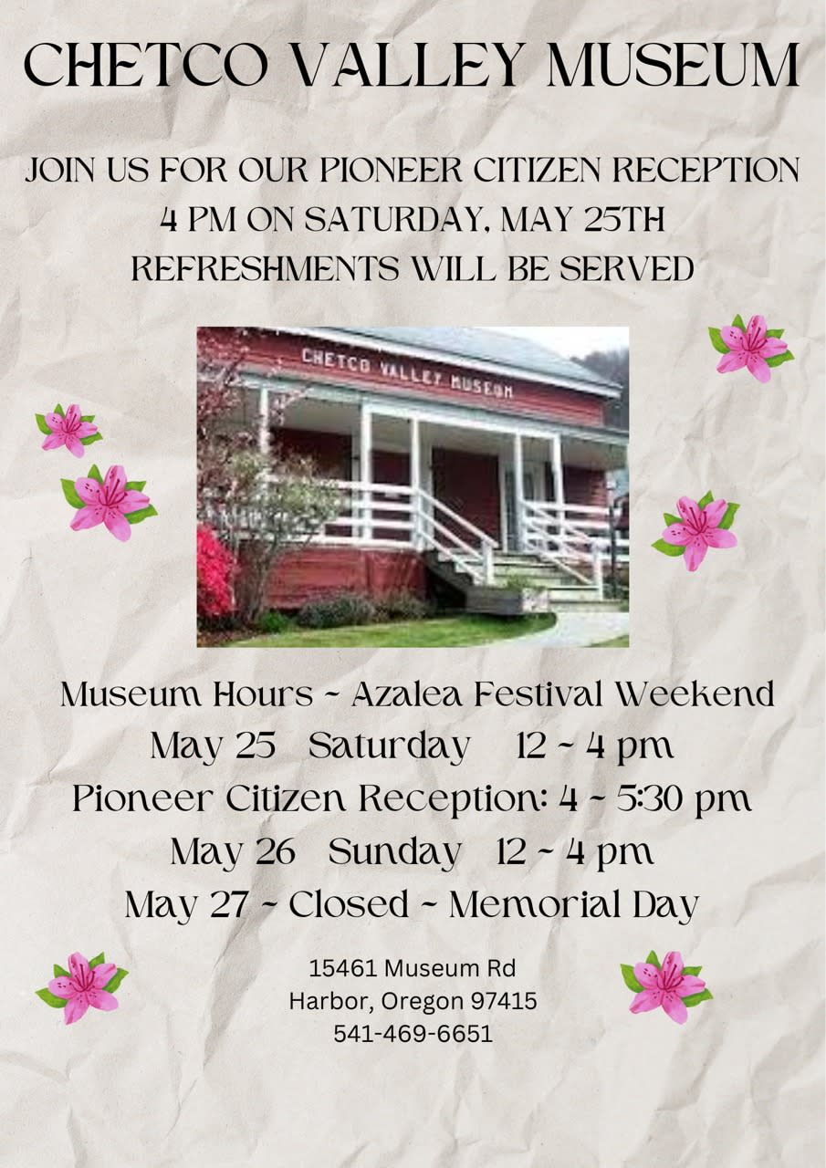 Join us at Chetco Valley Museum for our Pioneer Citizen Reception! 🗓️ Date: Saturday, May 25th 🕓 Time: 4:00 PM 🍹 Refreshments will be served Explore our exhibits during Azalea Festival Weekend: 🌺 May 25th (Saturday): 12:00 PM - 4:00 PM 🎉 Pioneer Citizen Reception: 4:00 PM - 5:30 PM 🌺 May 26th (Sunday): 12:00 PM - 4:00 PM Please note: We'll be closed on May 27th for Memorial Day. 📍 Location: 15461 Museum Rd, Harbor, Oregon 97415 📞 Contact us at 541-469-6651 for more information. Don't miss this opportunity to celebrate and honor our pioneer citizens! 🎊Images