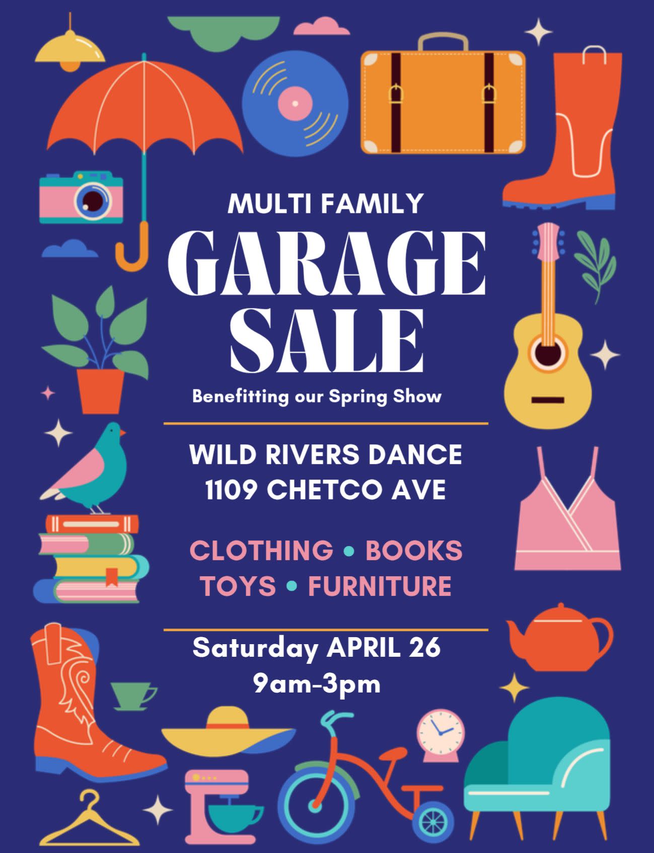 Wild Rivers Dance Multi Family Garage Sale Fundraiser benefitting our Spring Show! Bring your items in Friday April 25 after 4pm. Sale starts Saturday the 26th!!Images