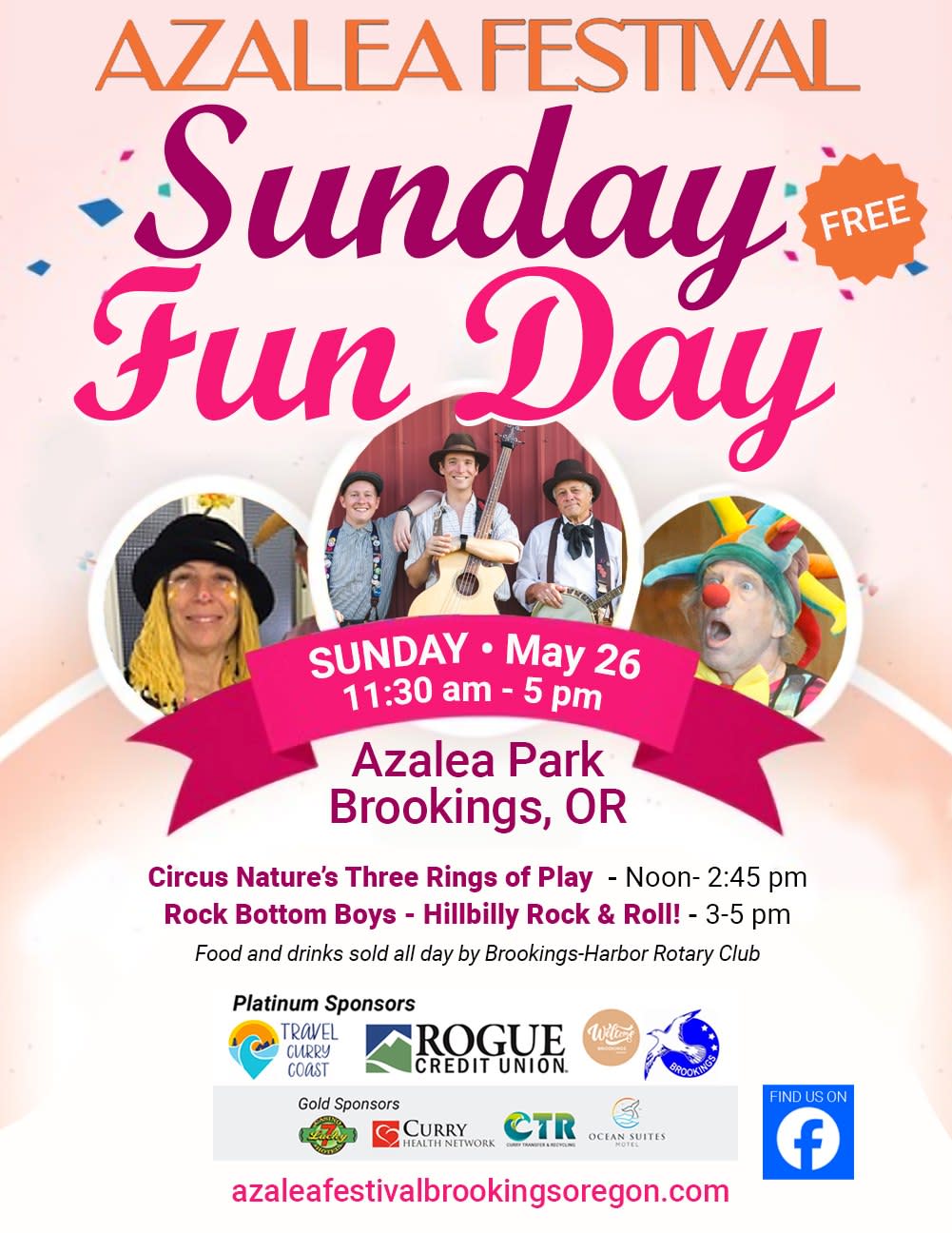 Fun times and happy music is the theme of the day For Sunday Fun Day at Azalea Park. Enjoy the hands-on, interactive activities and performances by members of the Circus Nature's Three Rings of Play from 12-2:45 p.m., followed by the high-energy, comedic hillbilly rock and roll of the Rock Bottom Boys at 3 p.m. The Brookings-Harbor Rotary Club will offer food and drinks all day starting at 11:30 a.m. Thank you to our platinum sponsors Rogue Credit Union, Travel Curry Coast and the city of Brookings!Images