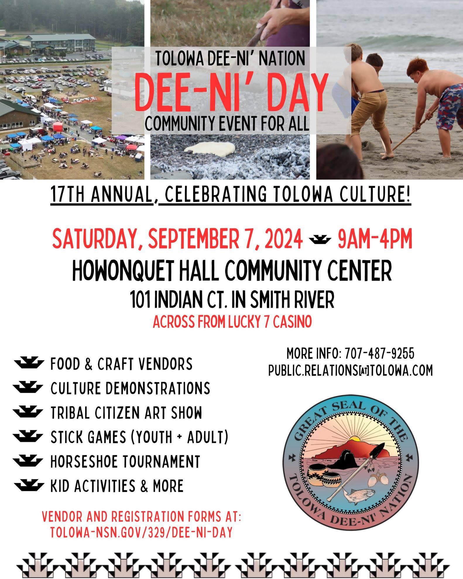 The 17th Annual Dee-ni' Day event is scheduled in Smith River on Saturday, September 7th from 9am-4pm! For more information call us at 707-487-9255. We are looking forward to this special day with the community. Open to everyone, join us!