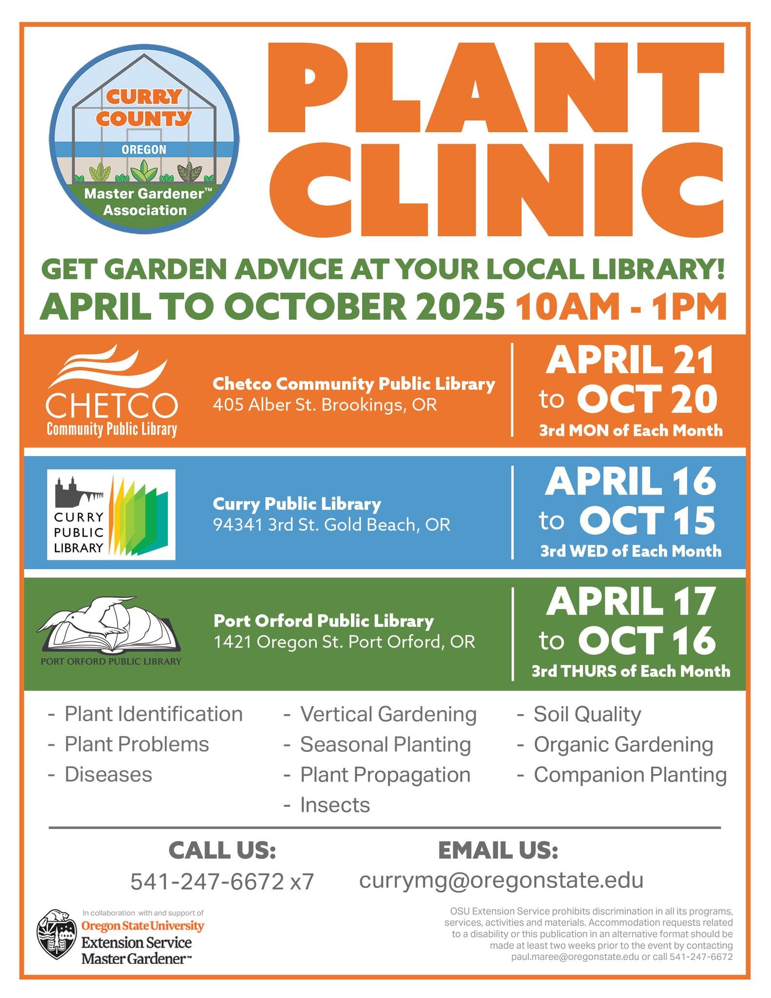 Gardeners are welcome to bring in a sample of their ailing plants and receive guidance and care tips from experienced volunteers with OSU's Master Gardener™ Extension Program! This free service takes place at the Chetco Library every third Monday of the month, April through October.